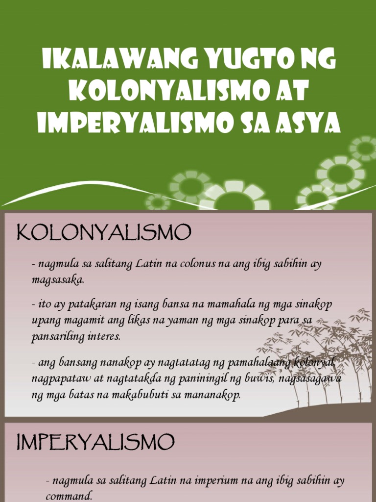 MGA DAHILAN NG IKALAWANG YUGTO NG IMPERYALISMO AT KOLONYALISMO SA TIMOG AT KANLURANG ASYA KOLONYALISMO nagmula sa salitang Latin na colonus na ang ibig sabihin ay magsasaka-Ito ay isang patakaran ng isang bansa na mamamahala ng mga sinakop upang magamit ang likas na yaman ng mga sinakop para sa sariling interesIMPERYALISMO nagmula sa salitang Latin na imperium na ang ibig sabihin. Read Chapter 24 - Agua from the story Duyog. Sa ingles ang ibig sabihin ay Stage.