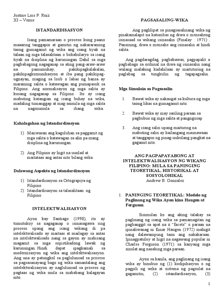 Istandardisasyon At Intelektwalisasyon Ng Wika