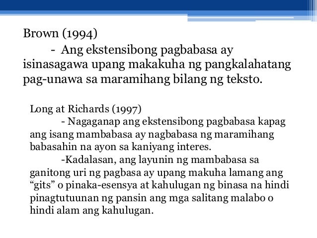 28102019 Ang pagkakatulad ng intensibo at ekstensibong pagbasa ay pareho silang uri ng pagbasa. Sa ganitong uri ng pagbasa nakatutulong ang pagbabalangkas o paggawa ng. Ayon sa Webster Dictionary ang pagbasa ay gawain ng isang taong bumabasa ng aklat at iba pang mga sulatin.