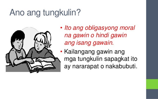 Ang tungkulin ay obligasyong moral ng tao na gawin o hindi gawin ang isang gawin. Alin sa sumusunod ang hindi ibig sabihin nito. Nakasalalay ang tungkulin sa isip.
