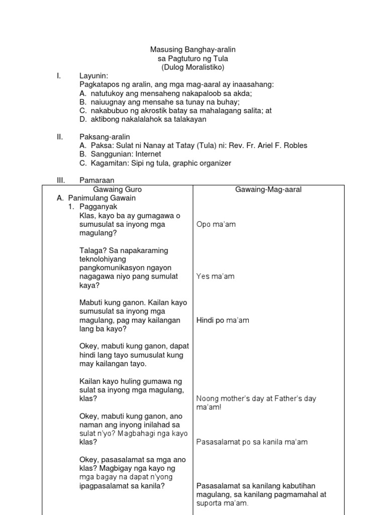 Ano ang ibig sabihin ng layunin sa banghay aralin. Ito rin ang sinusunod ng guro sa. 2492012 Mala-Masusing Banghay Aralin sa Filipino 3 I. Nailalahad nang maayos at wasto ang pansariling pananaw opinyon at saloobin F8PS-IIId-e-31 Paksang Aralin 1.